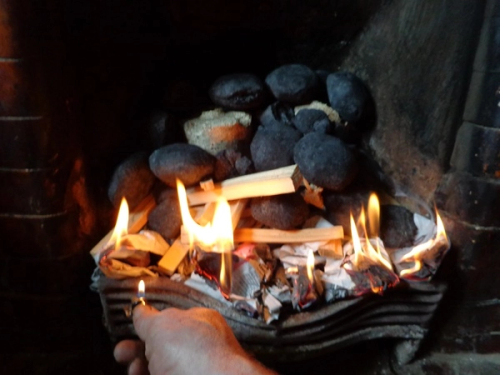 The burn has begun as the kindling ignites the chimney warms and the draw increases!